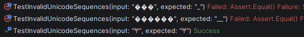 The thing that caught my eye was the number of characters. Why were there three and six undisplayable characters when the input had been one and two characters, respectively? After debugging every mistake I could have made, I found this GitHub issue about xUnit’s serialization of Unicode strings . It was closed because this behaviour is by design. The issue linked to an older discussion about string values in MemberData . Essentially, xUnit serializes strings to UTF-8, which breaks invalid Unicode sequences.